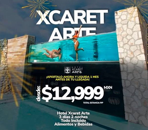 ¡Apártalo ahora y liquida 1 mes antes de tu llegada! Este es el "sí quiero" que estabas esperando para tu próxima escapada. ó𝐦𝐩𝐫𝐚𝐥𝐨 𝐚 𝐭𝐮 𝐫𝐢𝐭𝐦𝐨. Este aniversario viene con arte, sabor y adrenalina. Vive 3 días y 2 noches en el exclusivo Hotel Xcaret Arte